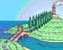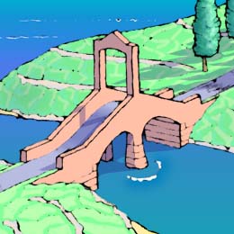 This is the Princesses' Bridge, and as you can see, it is the only way of getting across the shallow sound, that separates the Isle from the mainland of Clemencia, without getting one's feet wet. You can of course swim across through the deliciously azure waters - or at low tide, wade across. Sharks have occasionally been reported, though this is rare. The story is told of a German baron called von Luftballon who was once attacked by a five meter long monster as he swam there. Without losing his cool as the creature tried to devalue him of his left thigh, the baron took off his helmet and walloped it in the snout, stunning it to a standstill, giving him the time to struggle from the water.